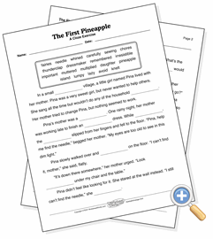 A cloze exercise is one in which certain words of a passage are removed and the student is required to put them back in the right place. This activity tests the student’s ability to understand the vocabulary and context. The words removed from the text are the vocabulary words from the reading.