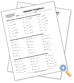 This worksheet is the foundation of becoming intimately familiar with letters. This exercise can be performed by any child who knows the entire alphabet and its order by heart. Begin with letter order problems that only ask for letters that follow, first working on accuracy and then speed. Move on to letters that come between others, and finally letters that come before. By the time the student can do the entire worksheet with an average of two seconds per problem, their brains will become hard-wired to recognize letter order. This makes them significantly better at sorting and dictionary skills introduced later.