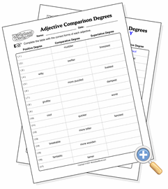 This worksheet presents a table for the student to complete. Each row contains a different adjective of a degree, with the rest of the cells empty. For example, every row could have the positive degree given, such as small. The other cells should then be filled in with the comparative and superlative degrees - smaller and smallest.