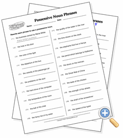 This worksheet presents a list of phrases that describe a noun “owned” by another noun, but without using a possessive form. The student’s task is to rewrite the phrase so that the possessive form of the owner noun is used.