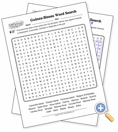 This page creates a word search puzzle using the locations from a map of Guinea-Bissau. Word searches are good tools for helping students memorize a list of locations and how they are spelled.