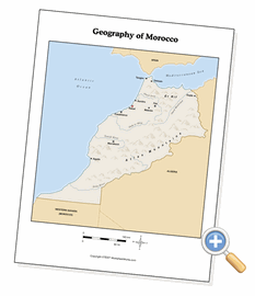 This page creates comprehensive geography maps of Morocco. You can select from several presentation options, including the map’s context and legend options. Black and white is usually the best for black toner laser printers and photocopiers. This allows to you configure the way Morocco is presented so that you can use the map for exactly what you need it for - as a reference, a quiz or something for students to annotate while doing research.