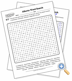 This page creates a word search puzzle using the locations from a map of Alberta. Word searches are good tools for helping students memorize a list of locations and how they are spelled.