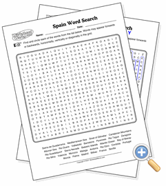 This page creates a word search puzzle using the locations from a map of Spain. Word searches are good tools for helping students memorize a list of locations and how they are spelled.
