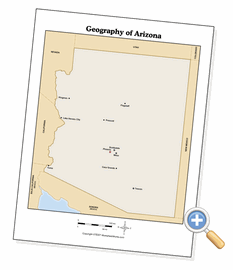 This page creates human geography maps of Arizona. You can select from several presentation options, including the map’s context and legend options. Black and white is usually the best for black toner laser printers and photocopiers. This allows to you configure the way Arizona is presented so that you can use the map for exactly what you need it for - as a reference, a quiz or something for students to annotate while doing research.
