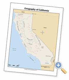 This page creates physical geography maps of California. You can select from several presentation options, including the map’s context and legend options. Black and white is usually the best for black toner laser printers and photocopiers. This allows to you configure the way California is presented so that you can use the map for exactly what you need it for - as a reference, a quiz or something for students to annotate while doing research.