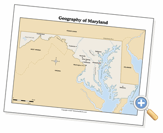 This page creates comprehensive geography maps of Maryland. You can select from several presentation options, including the map’s context and legend options. Black and white is usually the best for black toner laser printers and photocopiers. This allows to you configure the way Maryland is presented so that you can use the map for exactly what you need it for - as a reference, a quiz or something for students to annotate while doing research.