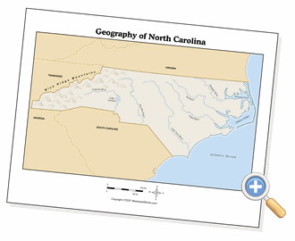 This page creates physical geography maps of North Carolina. You can select from several presentation options, including the map’s context and legend options. Black and white is usually the best for black toner laser printers and photocopiers. This allows to you configure the way North Carolina is presented so that you can use the map for exactly what you need it for - as a reference, a quiz or something for students to annotate while doing research.