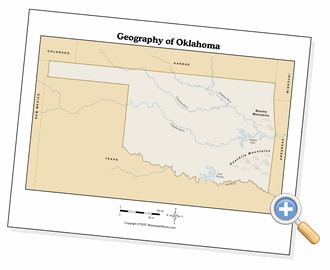 This page creates physical geography maps of Oklahoma. You can select from several presentation options, including the map’s context and legend options. Black and white is usually the best for black toner laser printers and photocopiers. This allows to you configure the way Oklahoma is presented so that you can use the map for exactly what you need it for - as a reference, a quiz or something for students to annotate while doing research.