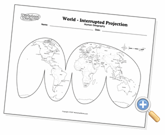 This interrupted projection map can be configured to display just the human attributes of the Earth such as national boundaries and major cities. You can also choose to display the compass, map scale and Europe-Asia border.