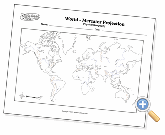 This Mercator projection map can be configured to display just the physical attributes of the Earth’s surface such as major lakes, seas, rivers and mountain ranges. You can also choose to display the compass and map scale.