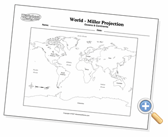 This Miller projection map can be configured to display just the oceans and continents. You can also choose to display the compass, map scale and Europe-Asia border.