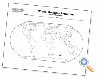 This Robinson projection map can be configured to display just the physical attributes of the Earth’s surface such as major lakes, seas, rivers and mountain ranges. You can also choose to display the compass and map scale.