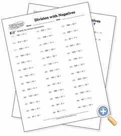 This exercise helps students get started understanding that negative numbers can be divided into one another. They will first need to understand that the result of dividing a negative with a positive is always negative and that the result of dividing two negatives is always positive. Depending on your settings below, some regular (non-negative) division problems will be added to the page.