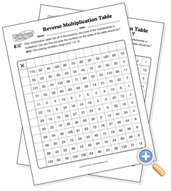 This multiplication table is the opposite of a regular table. All of the products are given, but the numbers along the sides are not. Students will need to use deduction skills to find out what goes in the missing spaces. This type of table also helps develop factoring skills.