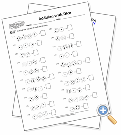 One useful way of teaching simple addition is with dice. If you have a few dice handy, then certainly that would be a good tool to use. However, this worksheet displays dice for the student to count, which is almost as good. Select a low and high number of dice to display, and if the student is new to this it might also be a good idea to request that the dice be neatly lined up.