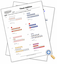 These worksheets help to introduce basic addition by working with what the student already knows: how to count. Each addition operation is shown as both an equation of numerals and an equation of blocks. The blocks play the role of training wheels to let the student visually see how the two numerals can be used to produce a sum. There is also a worksheet generator for Visual Subtraction.