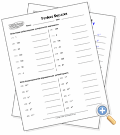 The Perfect Squares worksheet presents the student with a list of numbers that are the square of an integer. The student’s task is to figure out what that integer is.