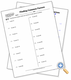 These exercises have students find all numbers which are factors in two composite numbers. The approach they use can involve prime factorization or just iterating through numbers looking for the ones which are factors of both composites.