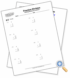 These problems involve the division of simple fractions into a whole number (or the reverse). In some cases there will be the opportunity for cross-reduction before multiplying, and some answers will simplify to a mixed fraction.