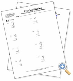 These problems involve the division of two mixed fractions. This provides the most difficult fraction multiplication problem since it involves converting to improper fractions, inverting the second fraction, cross-reducing, multiplying and finally simplifying in each problem.
