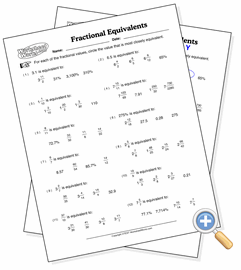 This worksheet provides practice in converting between different types of fractions, including decimals and percents. For each problem, the student is given one fractional type and asked which of the others are equivalent in value. The more difficult levels use larger numerators and denominators, but also perform some sneaky operations to disguise their equivalency.