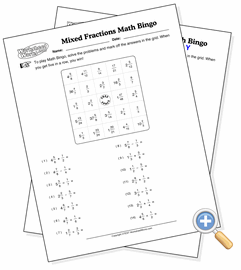 In the game of bingo, the objective is to fill five cells in a grid in any direction. The middle cell is usually a giveaway (“free space”). In this exercise, the answers to a set of mixed fraction problems need to be matched to cells in a bingo sheet. As in the real game, not all answers will be in the grid, and not all grid cells will have a matching answer. But there will be exactly one game-winning series on the board.
