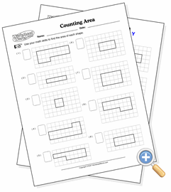 This worksheet introduces the concept of shape area without forcing the student to actually make any computations. If they want to, they can simply count the number of squares that the shape makes up. If they already understand multiplication, they will quickly realize that they can compute the area much faster by using that skill. At higher difficulty levels, parts of the shapes often have sides that are not at clean ninety degree angles. You may want to explain how they can find the answer by first treating the area as a rectangle, then dividing the result by two. In all cases, the area of shapes will come out to be exact integers, so no knowledge of fractions is necessary for this exercise.