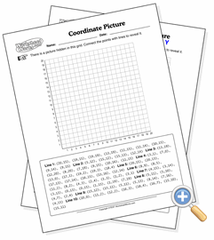 This worksheet provides the student with four series of points, with their task being to plot them on the graph and connect the dots, revealing a picture. It’s kind of like connect the dots, but with grid coordinates.