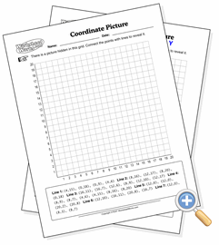 This worksheet provides the student with four series of points, with their task being to plot them on the graph and connect the dots, revealing a picture. It’s kind of like connect the dots, but with grid coordinates.