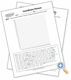 This worksheet provides the student with four series of points, with their task being to plot them on the graph and connect the dots, revealing a picture. It’s kind of like connect the dots, but with grid coordinates.