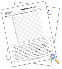 This worksheet provides the student with four series of points, with their task being to plot them on the graph and connect the dots, revealing a picture. It’s kind of like connect the dots, but with grid coordinates.