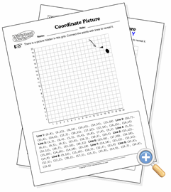 This worksheet provides the student with four series of points, with their task being to plot them on the graph and connect the dots, revealing a picture. It’s kind of like connect the dots, but with grid coordinates.