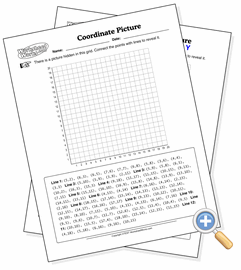 This worksheet provides the student with four series of points, with their task being to plot them on the graph and connect the dots, revealing a picture. It’s kind of like connect the dots, but with grid coordinates.