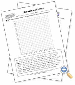 This worksheet provides the student with four series of points, with their task being to plot them on the graph and connect the dots, revealing a picture. It’s kind of like connect the dots, but with grid coordinates.