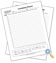 This worksheet provides the student with four series of points, with their task being to plot them on the graph and connect the dots, revealing a picture. It’s kind of like connect the dots, but with grid coordinates.
