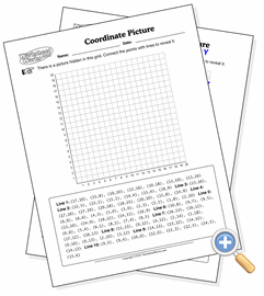 This worksheet provides the student with four series of points, with their task being to plot them on the graph and connect the dots, revealing a picture. It’s kind of like connect the dots, but with grid coordinates.