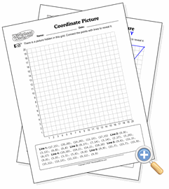 This worksheet provides the student with four series of points, with their task being to plot them on the graph and connect the dots, revealing a picture. It’s kind of like connect the dots, but with grid coordinates.