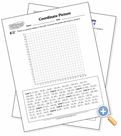 This worksheet provides the student with four series of points, with their task being to plot them on the graph and connect the dots, revealing a picture. It’s kind of like connect the dots, but with grid coordinates.