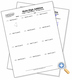 These are addition problems involving the sums of one-digit and two-digit numbers. The problem is given in a sentence so it’s up to the student to set it up and solve. You can choose whether or not to require regrouping, and the vertical guides can be helpful for those students who have trouble keeping their numbers neatly in columns.