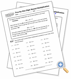 Some kinds of multiplication problems can be done faster in the head using estimation than on paper. Two-digit by one-digit multiplication is a prime example. By rounding up or down on the tens place to get a close value, the single-digit difference can be multiplied separately and either added or subtracted from the result. Use these problems to develop this extremely useful skill and end the slow pencil-and-paper multiplication.