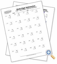 These are subtraction problems involving the differences between one-digit and two-digit numbers. You can choose whether or not to require regrouping, and the vertical guides can be helpful for those students who have trouble keeping their numbers neatly in columns.