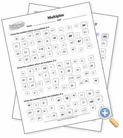 This worksheet gives the student practice in identifying numbers that are multiples of some other number, such as three or five. Select the values you want to ask for multiples of from the ones available.