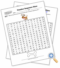 In this maze, the correct path to the finish is determined by the series of integers, beginning (or ending, if you choose) with the number 1. The non-path cells in the maze also have numbers, but they are not part of the ordered series so they cannot be followed. Moves can be made up, down, left and right, but not diagonally. You can select the scenario for the maze that determines the story and graphics used in the maze worksheet.