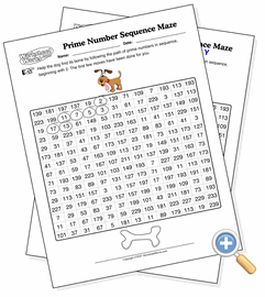 In this maze, the correct path to the finish is determined by the series of prime numbers, beginning (or ending, if you choose) with the smallest prime number, 2. The non-path cells in the maze also have prime numbers, but they are not part of the ordered series of primes so they cannot be followed. Moves can be made up, down, left and right, but not diagonally. You can select the scenario for the maze that determines the story and graphics used in the maze worksheet.