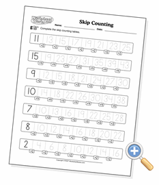 Skip counting is an essential skill to have when making the jump from counting to basic addition. This worksheet gives the student some primitive practice in skip counting by having them write out the numbers that complete the series. For a more involved skip counting exercise, try this sequence chart.