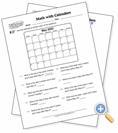 This worksheet presents a single calendar and asks the student questions about it that require both knowledge of how the calendar works and simple relative math (addition and subtraction).