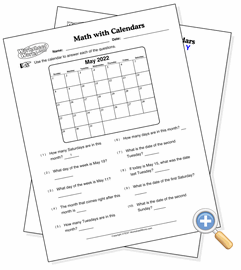 This worksheet presents a single calendar and asks the student specific questions about it, but avoids the need for actual math operations. The questions can be answered by any student who understands how a calendar is presented and works.