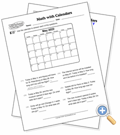 This worksheet presents a single calendar and asks the student questions that require reading individual word problems, consulting the calendar and performing basic math operations.