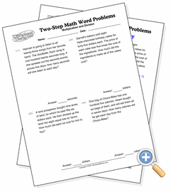 Two-step word problems have three numbers which must be operated on separately, and in the right order. They take much more understanding of the problem than simple word problems because they provide the information in a less structured form. For these problems, finding the answer involves multiplying two numbers and then dividing the product by another number.